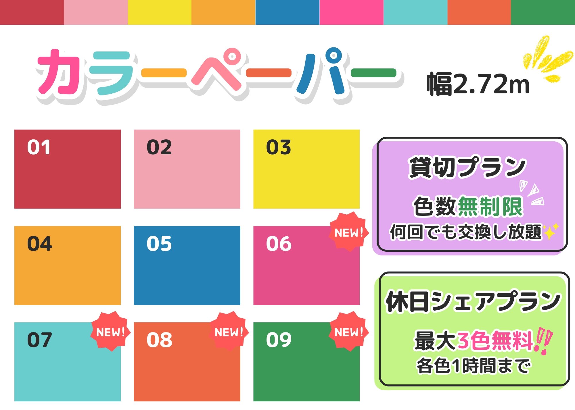 | カラーペーパー占有プラン 1時間以上同じ色を 使用したい方にオススメ◎ | 1色1時間毎/ 1,000円 |