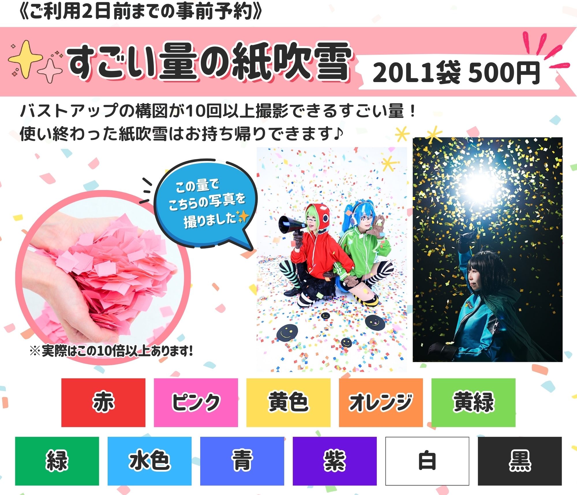 | すごい量の紙吹雪 《事前予約》ご利用2日前まで [ 紙吹雪の詳細はこちら🎉 ] | 1袋20L/ 500円 |